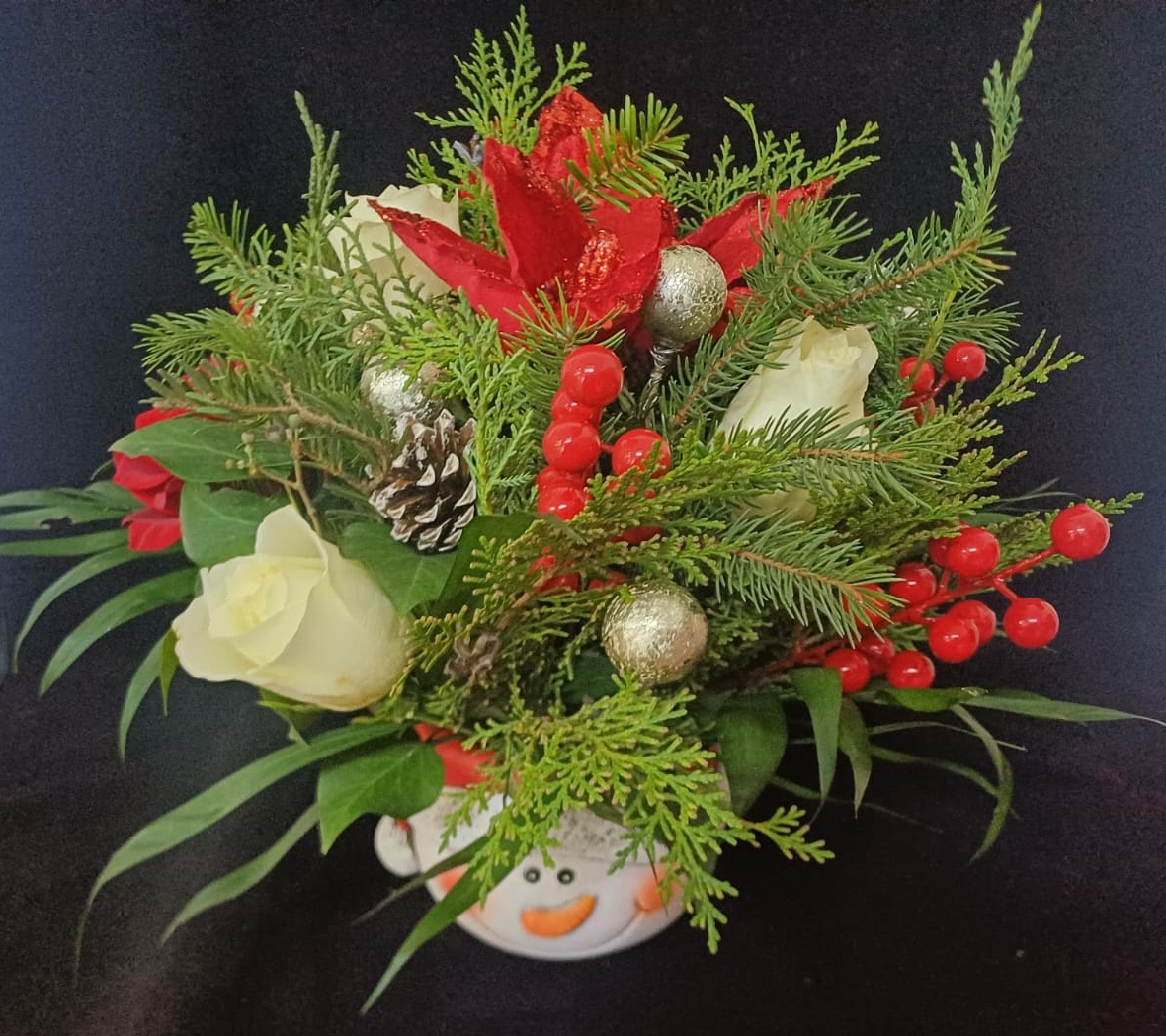 Acest aranjament floral de Crăciun aduce un aer festiv și plin de culoare oricărui decor. Realizat într-un suport ceramic drăguț cu chip de om de zăpadă, ansamblul combină armonios crenguțe proaspete de brad, crenguțe de thuya, 4 trandafiri albi și 3 trandafiri roșii, boabe roșii decorative, conuri ninse și globuri aurii.